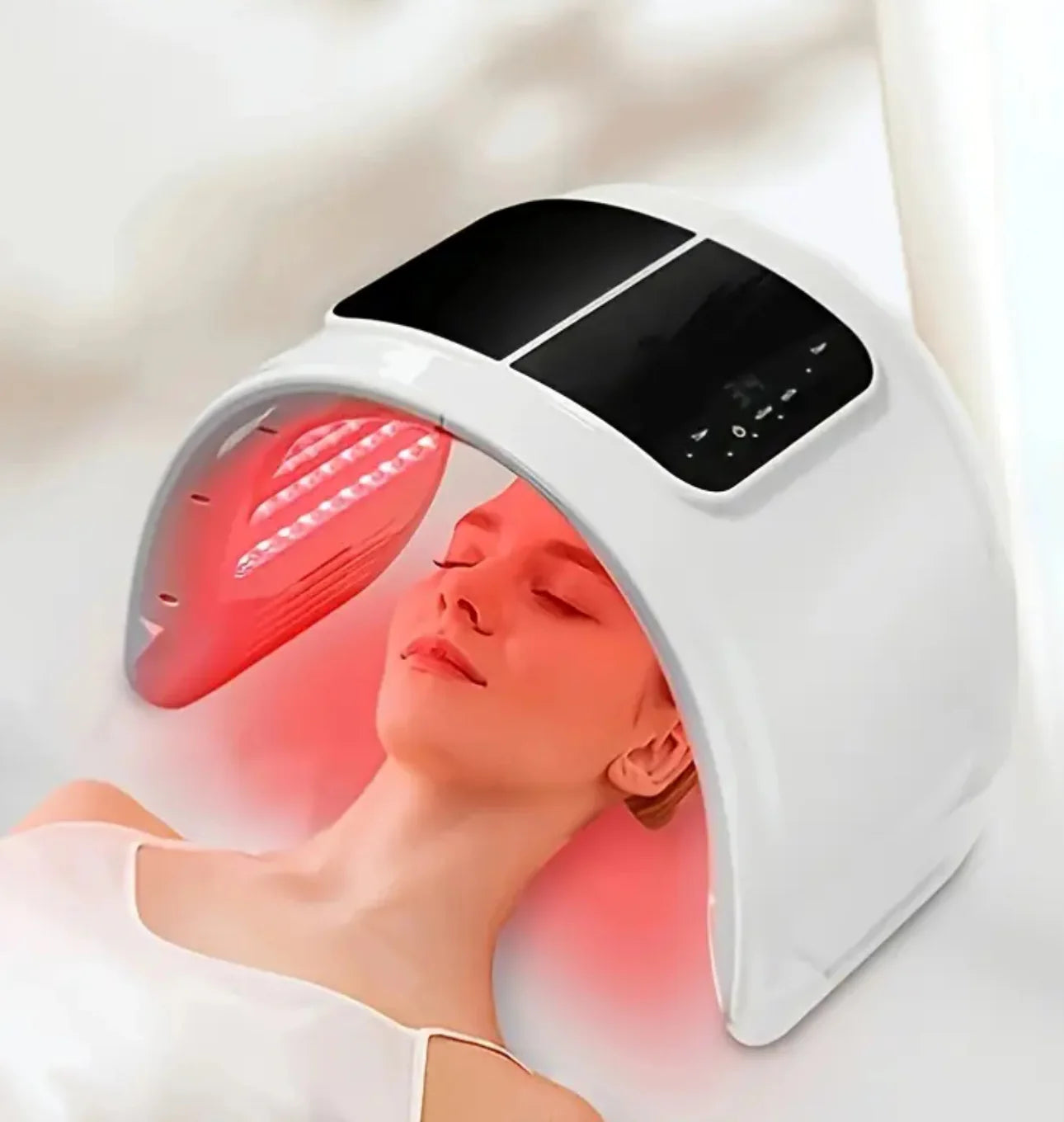 Dieses fortschrittliche Beauty-Gerät kombiniert 7 Farb-LED-Lichtmodimit gezielterHalsbeleuchtung, um Haut zu straffen, zu verjüngen und Akne zu reduzieren. Die innovative Photon-Technologie regt die Kollagenproduktion an, verbessert die Elastizitätund sorgt für einen strahlenden, gesunden Teint. Zusätzlich wirkt das Gerät als Gesichts- und Halsmassagegerät, das feine Linien glättet und die Haut sanft formt. Ideal für professionelle Ergebnisse zu Hause oder im Spa, bietet es eine multifunktionale und luxuriöse Hautpflege in einem Gerät.